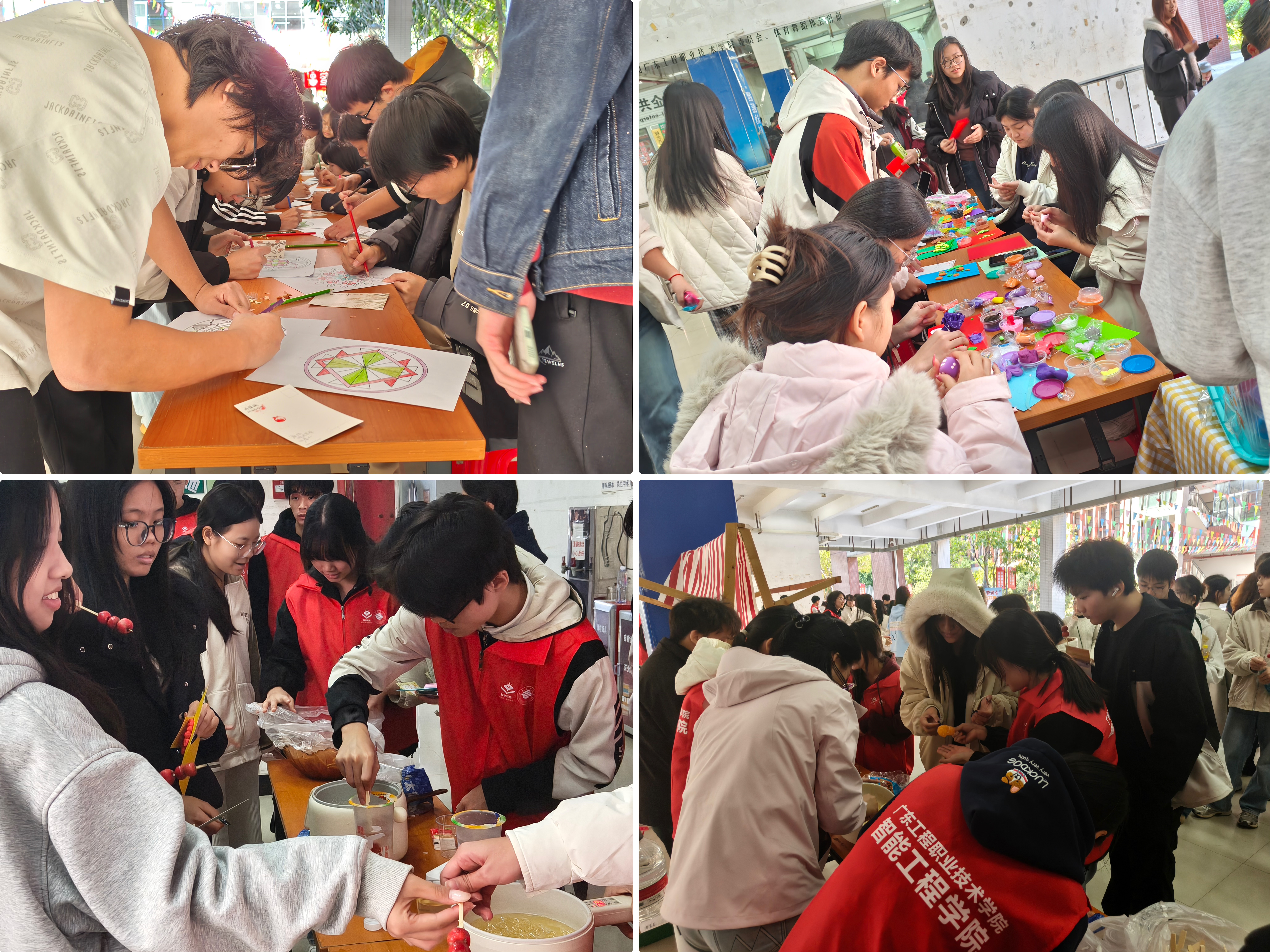 现场,同步开展的“以劳润心”新春游园活动,将劳动实践与心理调适相结合。活动设有三大主题区域:“心语心愿创作墙”让同学们通过制作冰糖葫芦和写下心愿,在劳动中建立情感联结;“传统手工艺体验区”通过粘土制作,帮助学生在专注中舒缓情绪、提升成就感;“身心专注力挑战区”则借助投射箭头、正念涂色等项目,训练情绪调节能力。现场还设置了“心语信箱”与心理知识展板,延伸心理科普与服务触角。