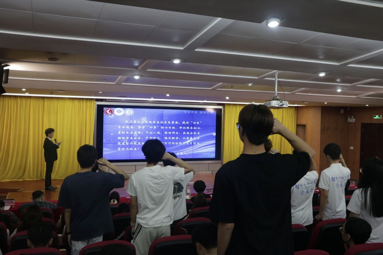 集体宣誓环节,“自我管理、自我服务、自我教育、自我监督” 的誓言字字铿锵、响彻会场,每一句承诺都彰显着自管会成员服务同学、共建美好社区的坚定决心。